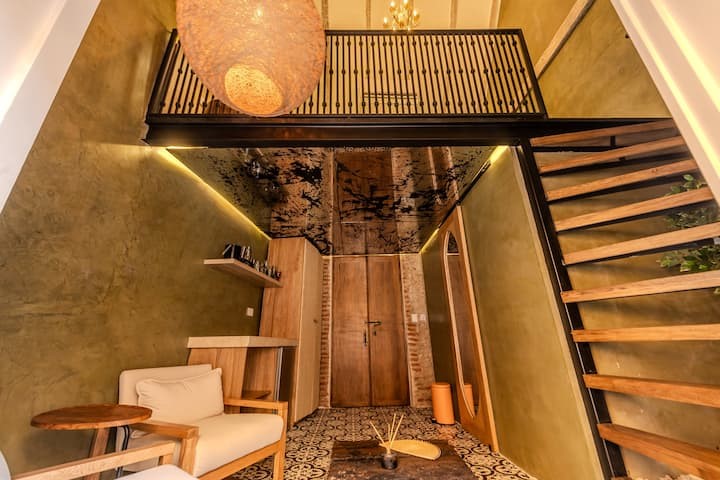 Nuestras habitaciones dúplex combinan la arquitectura original de la casa con una distribución en dos niveles. El dormitorio en el nivel superior cuenta con cama doble premium, televisor y minibar. El área social en el nivel inferior dispone de baño privado de lujo y balcón privado con vista al callejón histórico del Centro de Cartagena.